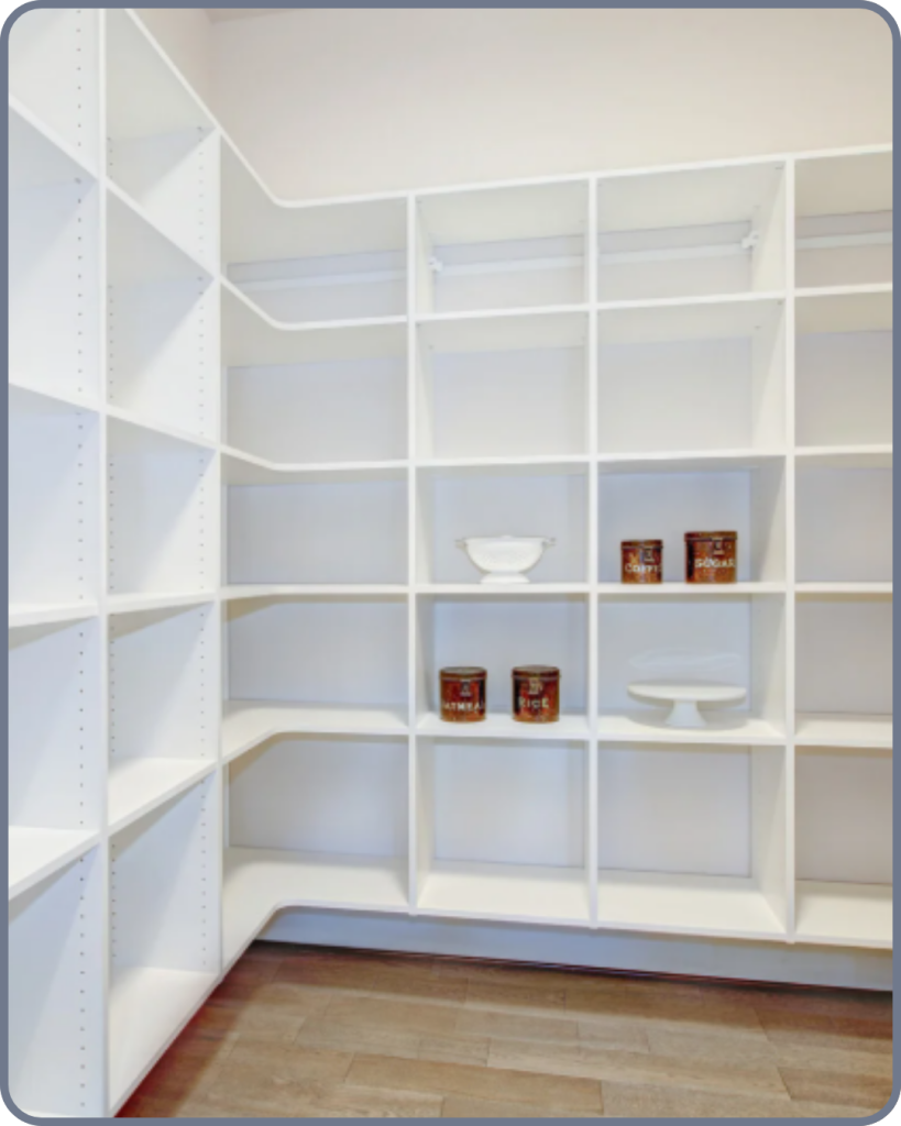 Bring clarity and elegance to your kitchen with our bespoke pantry solutions. Designed for seamless function and refined style, each space is tailored to fit the way you live – and cook.